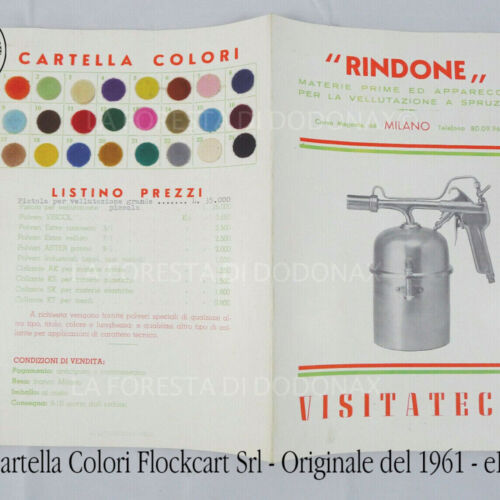 Il 14 novembre del 1961 Giovanni Rindone fonda la Flockcart srl Industria Carte Vellutate. Nella fabbrica di Lierna sul lago di Lecco inizia la produzione di carte vellutate, destinate alle argenterie, alle posaterie ed agli astuccifici e le polveri di Velluto utilizzate nella produzione, coloratissime, calde e coprenti, attirano l’attenzione dei primi scenografi che le utilizzeranno nei loro impianti scenografici aprendoci le porte del bellissimo mondo dello Spettacolo, permettendoci di dar sfogo alla nostra fantasia che introdurrà moltissimi altri splendidi materiali.